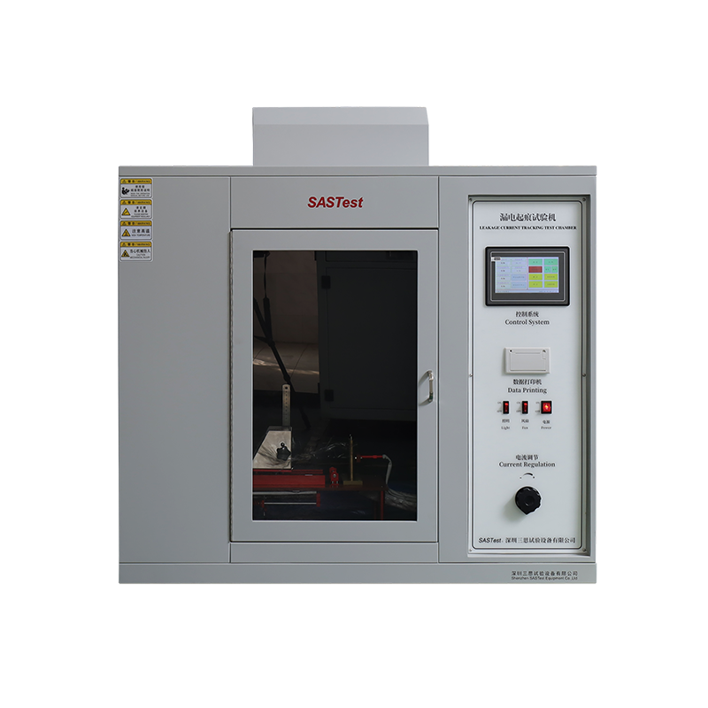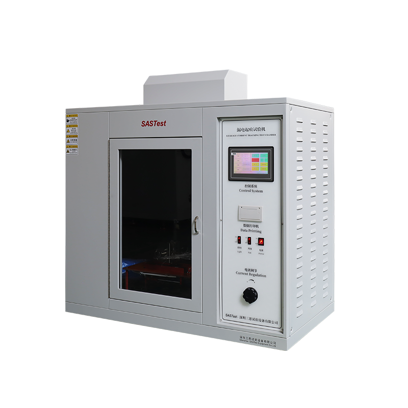 漏电起痕试验箱用于电器产品受潮湿和杂质环境的影响下,不同极性的带电部件之间或带电部件与接地金属部件之间可能会引起绝缘上的漏电,产生的电弧对电器造成击穿短路或由于放电使材料蚀损,甚至引燃导致火灾。本试验仪器就是模拟上述情况对绝缘材料进行的一种破坏性试验,用以测试和评定在规定电压下,绝缘体在电场和含杂质水作用时的相对耐漏电起痕性。适用于电工电子产品,家用电器的固体电器绝缘材料及其产品,如:继电器插座、转换开关盖、接触器躯体等。